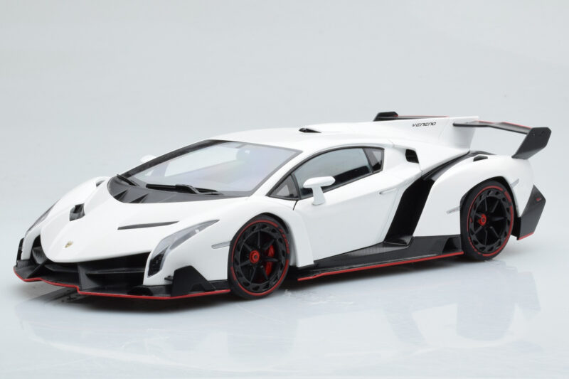 The Lamborghini Veneno Bianco AUTOart 1:18 is crafted from Pressofusione. Die-cast zinc alloy body with detailed plastic parts, rubber tires, and high-quality paint finish. Die-cast models are known for their weight, durability, and realistic feel.