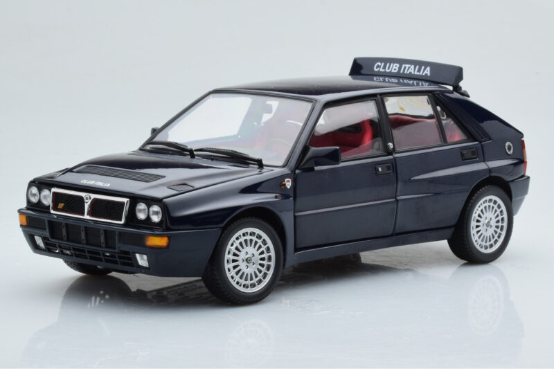 The Lancia Delta HF Integrale Club Italia Blu Kyosho 1:18 is crafted from Pressofusione. Die-cast zinc alloy body with detailed plastic parts, rubber tires, and high-quality paint finish. Die-cast models are known for their weight, durability, and realistic feel.