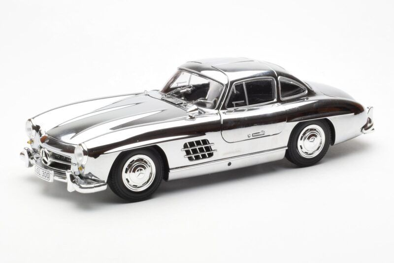 The Mercedes 300 SL W198 Cromo Minichamps 1:18 is crafted from Pressofusione. Die-cast zinc alloy body with detailed plastic parts, rubber tires, and high-quality paint finish. Die-cast models are known for their weight, durability, and realistic feel.