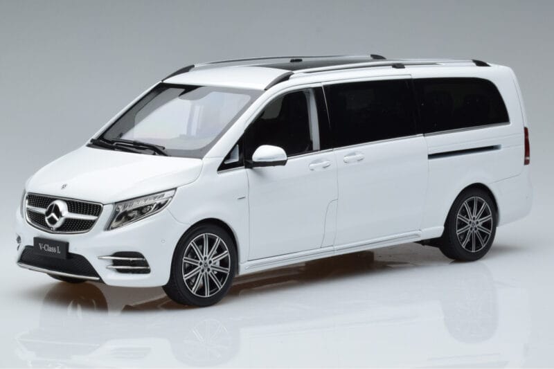 The Mercedes V-Class W447 V260L Bianco Mercedes 1:18 is crafted from Pressofusione. Die-cast zinc alloy body with detailed plastic parts, rubber tires, and high-quality paint finish. Die-cast models are known for their weight, durability, and realistic feel.