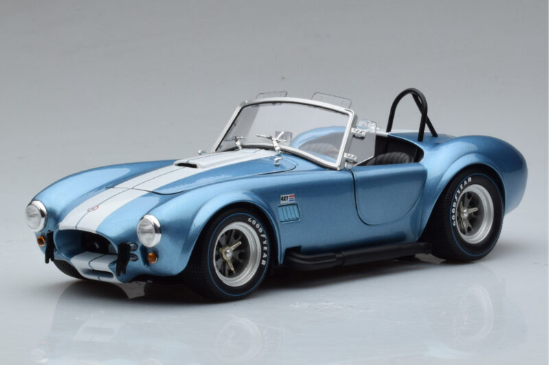 The Shelby Cobra 427 S/C Blu Chiaro Kyosho 1:18 is crafted from Pressofusione. Die-cast zinc alloy body with detailed plastic parts, rubber tires, and high-quality paint finish. Die-cast models are known for their weight, durability, and realistic feel.