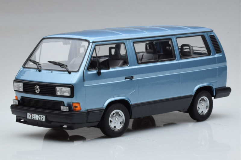 A 1:18 scale model measures approximately 25-28 cm (approximately 10-11 inches). The Volkswagen T3 Multivan Blu Norev 1:18 is perfect for display in a glass cabinet or on a shelf.
